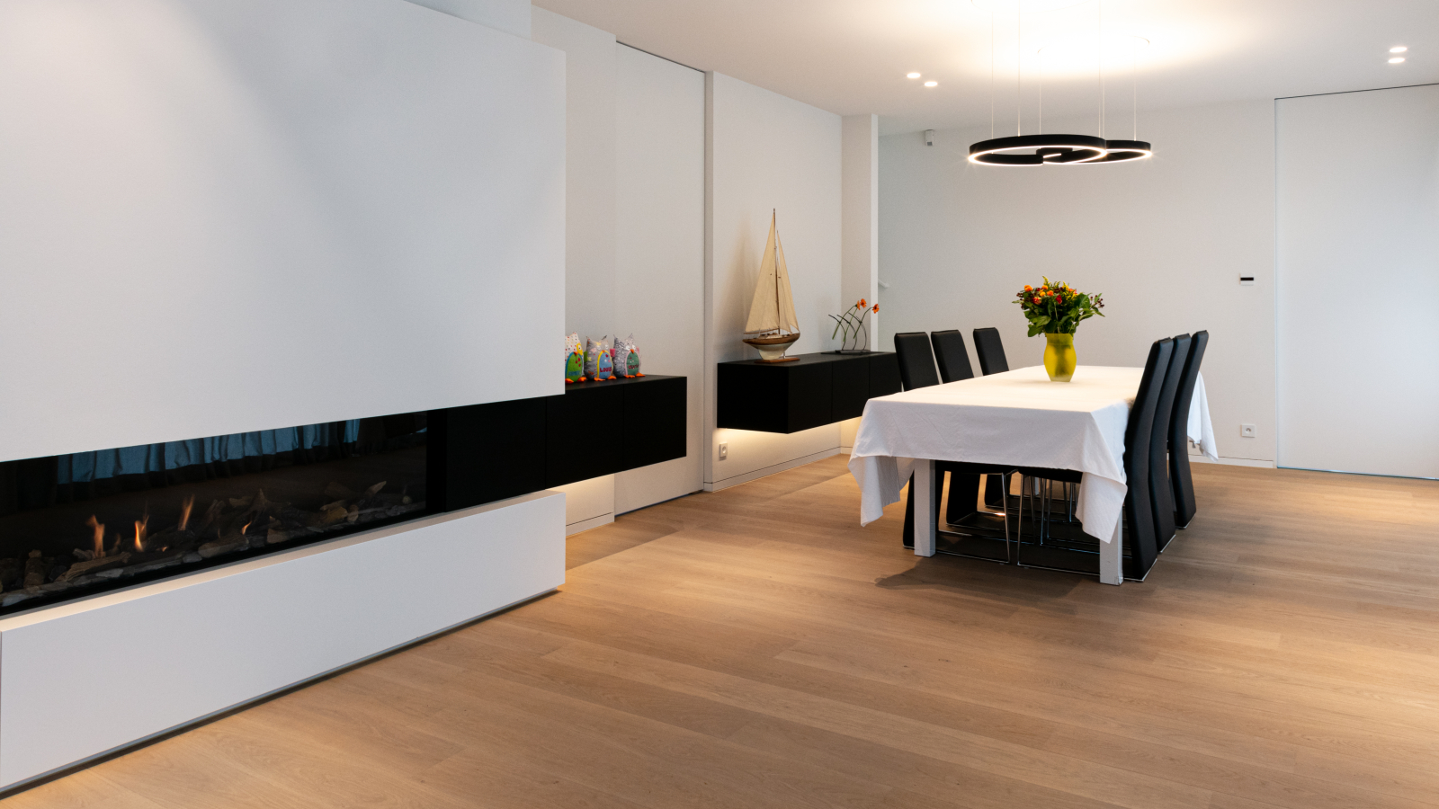 Minimalistische nieuwbouwwoning: Gelijkvloers en verdieping: Half massief Europees eiken parket / toplaag 6mm in 1e keuze eik Plankbreedte 20cm / V-voeg aan langszijden / geoliede afwerking (Grey Light)